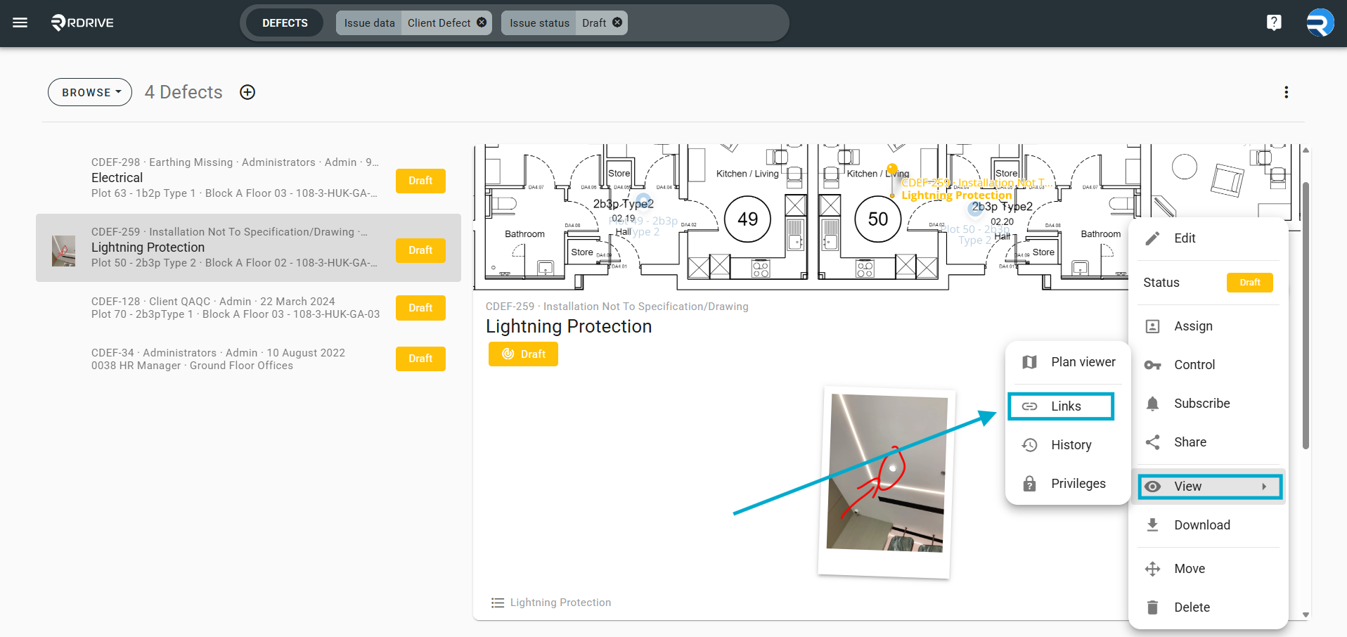 Once you have chosen your issue/defect/record, press the Menu ≡ button on the right-hand side of your screen as circled below to expand the menu and select "View" then "Links".