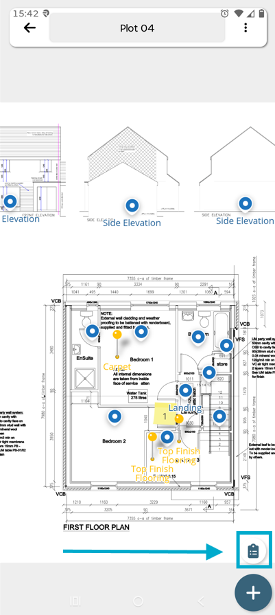 Once your required drawing or floor is open, you should now see blue "Location Pins"; all actions are raised against locations within a drawing. Click the blue pin required to get started raising actions to that location.