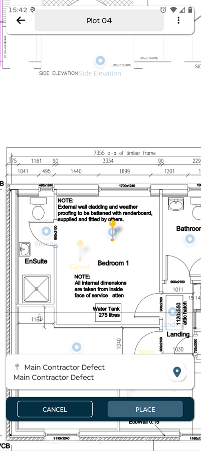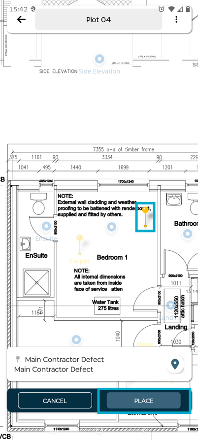 Once all mandatory fields are completed, select "Save" in the bottom right. The defect or form will now be added against the location on the drawing.