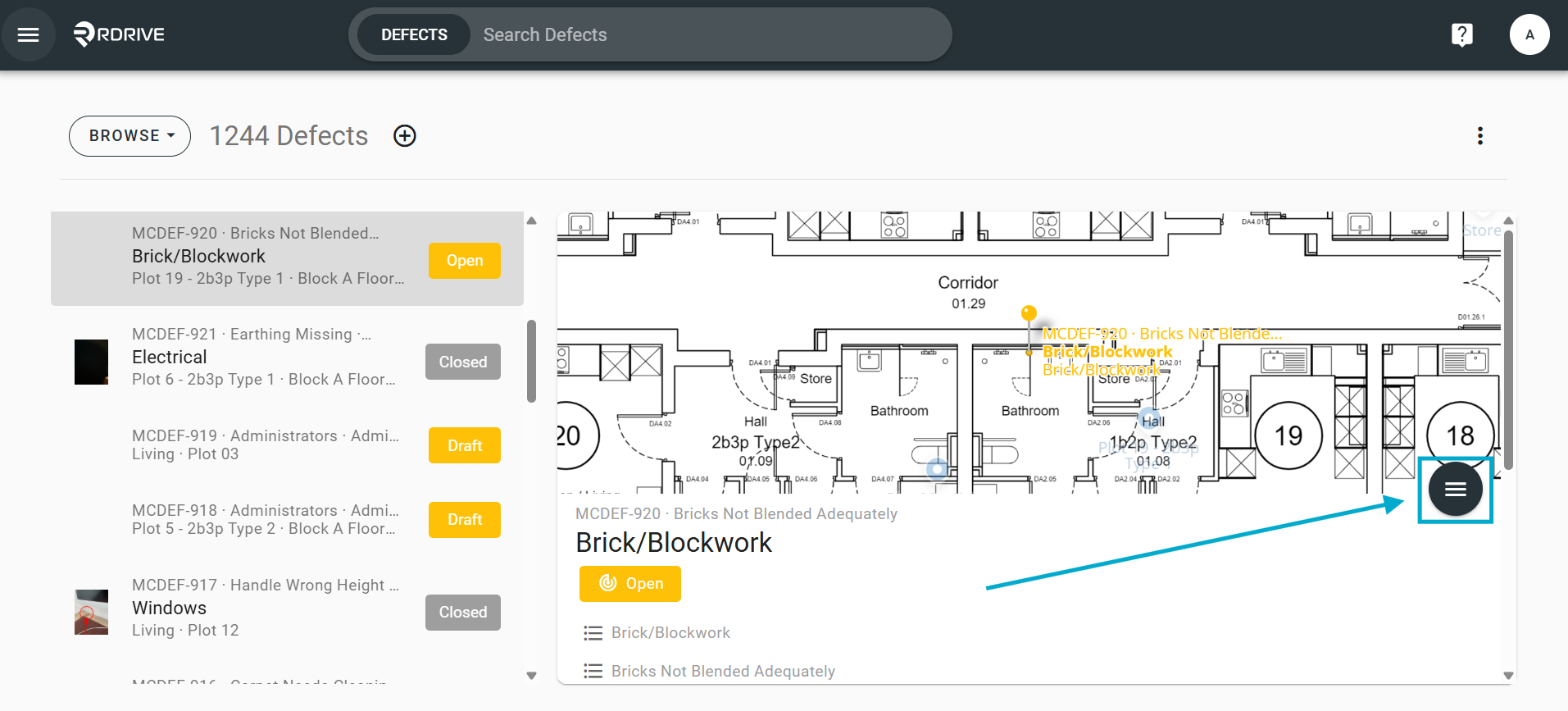 This will then display any issues/defects/records selected in a list on the left panel, choose your required issue/defect/record and press the ≡ button on the right to expand the menu.
