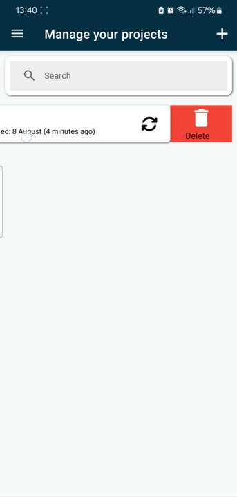 - From the Projects screen you should see a list of all projects you have access too, dragging the project name to the left will allow you to delete a project from your app