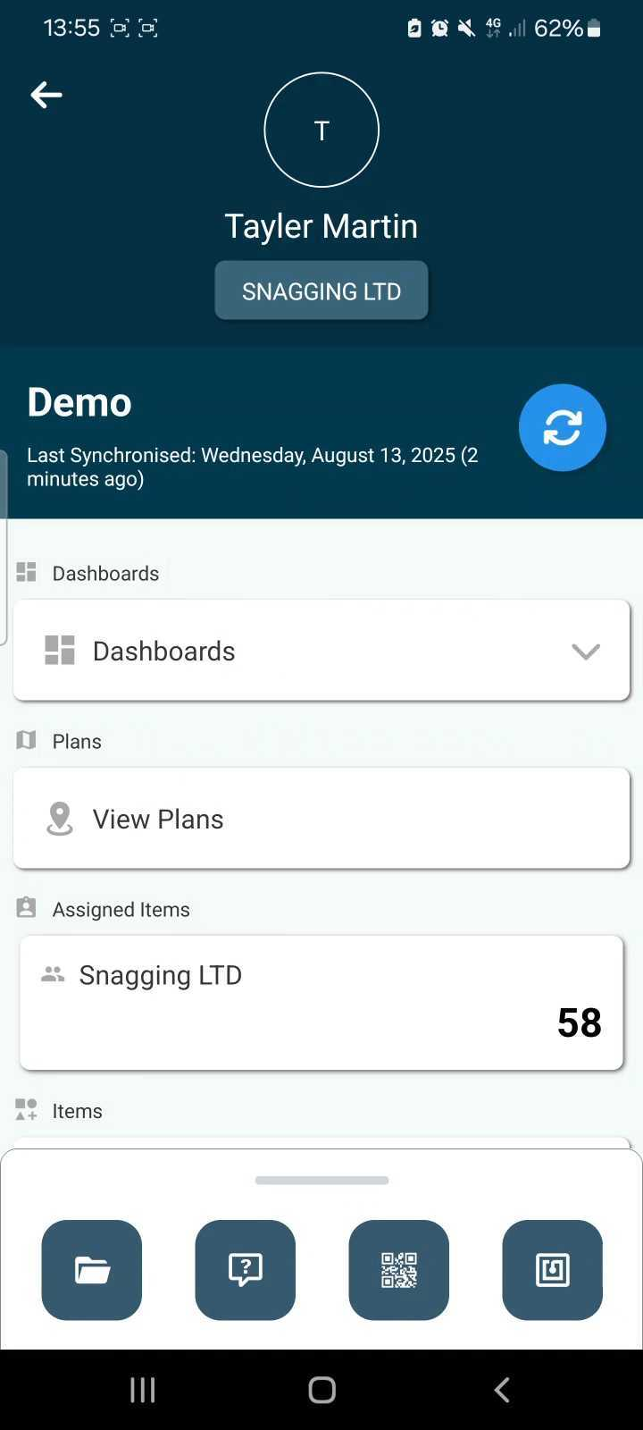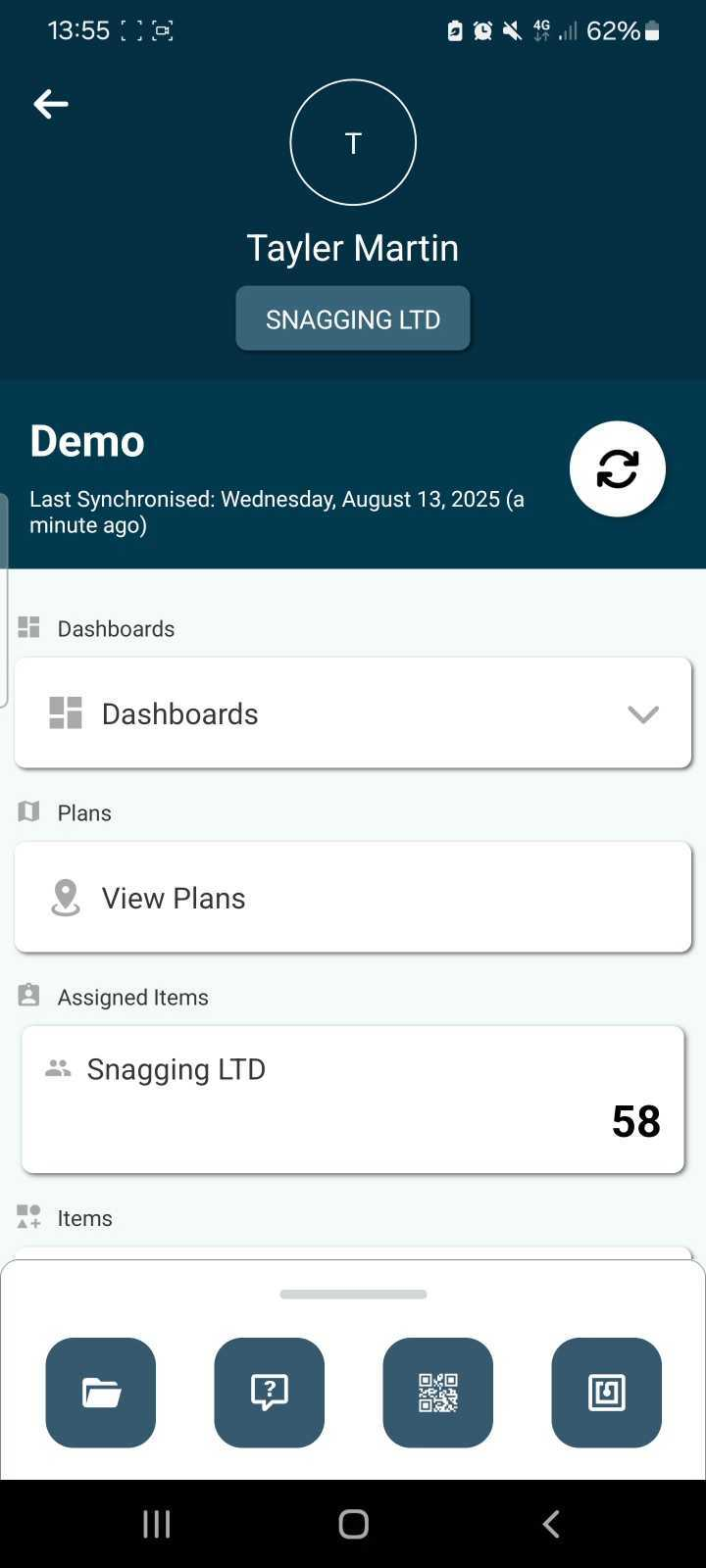 - Once you have then completed any work, coming back to the main menu will then show the sync icon in blue, this indicates a change has been made offline and requires syncing, click the blue sync icon to send these changes to the server.